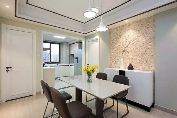 ✪餐厅吊顶富有线条感,餐边柜的背景墙带有不规则的花纹,与周边色彩搭配和谐。