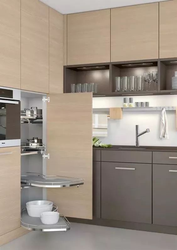 吊柜常见选用两层搁板,这样的弊端是看得见拿不着,或者根本看不见,其实可以设置部分开放式的格子,存放常用的调料品。