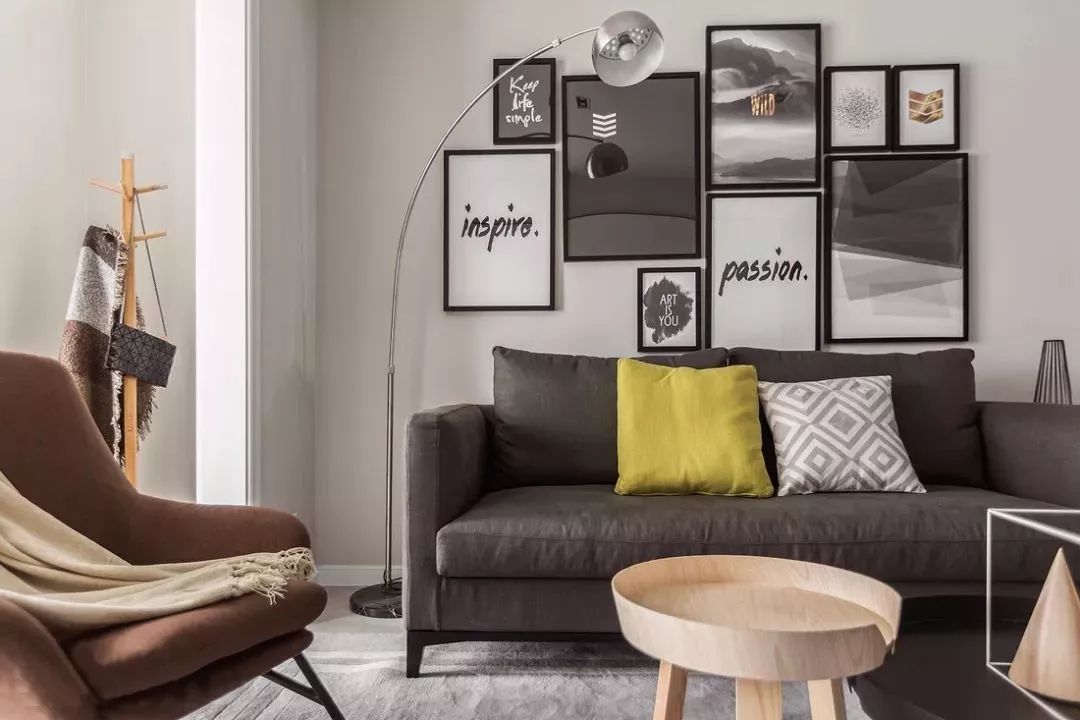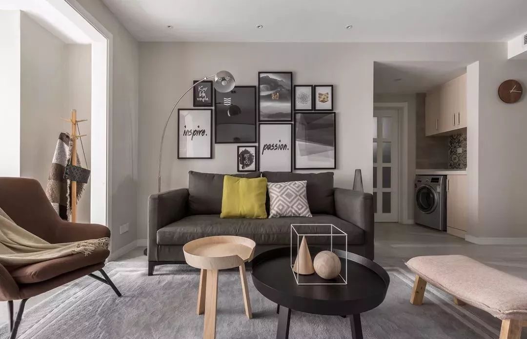 墙面采用水泥灰,搭配灰色的布艺沙发、灰色地毯,背景墙以一组装饰画点缀,打造简单明净的北欧风情。