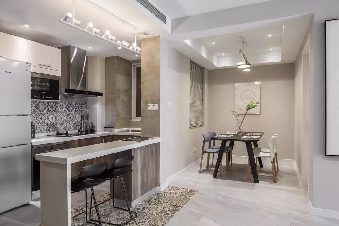 吧台区域采用花砖铺贴,别具一格的吊灯营造气氛,让小空间变得独特别致,整体更具小资情调。