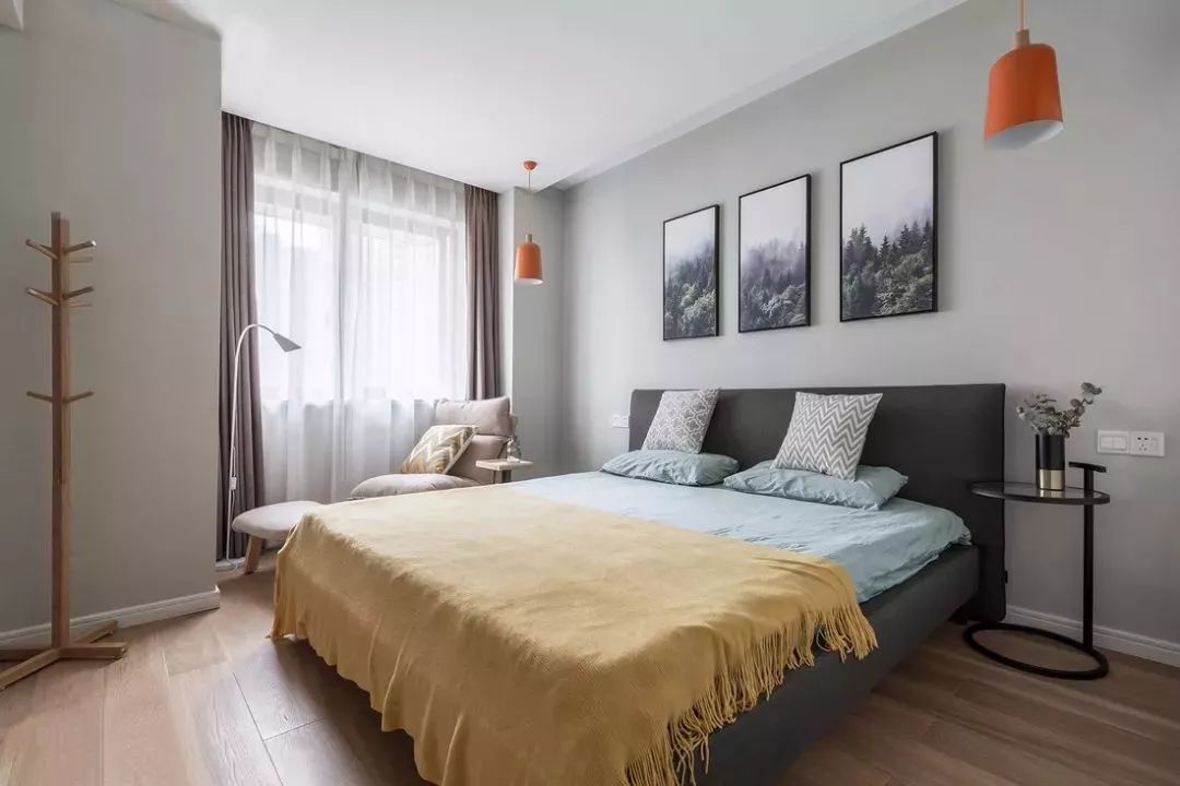 主卧灰调墙纸搭配森林背景画,为长期伏案剪辑的业主带来北欧森林的惬意放松。