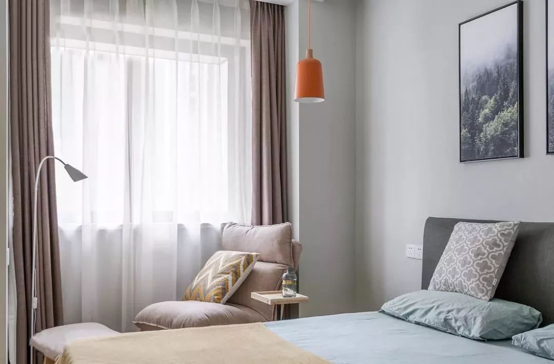 柔软舒适的躺椅临窗而立,轻松又惬意,橙色床头吊灯增添活力。