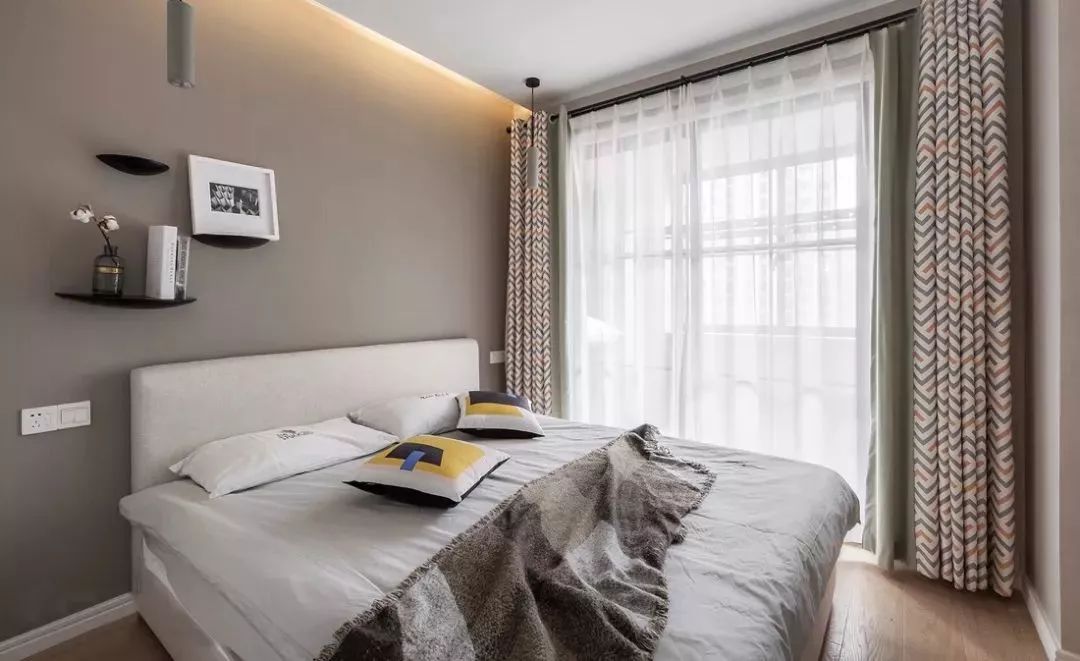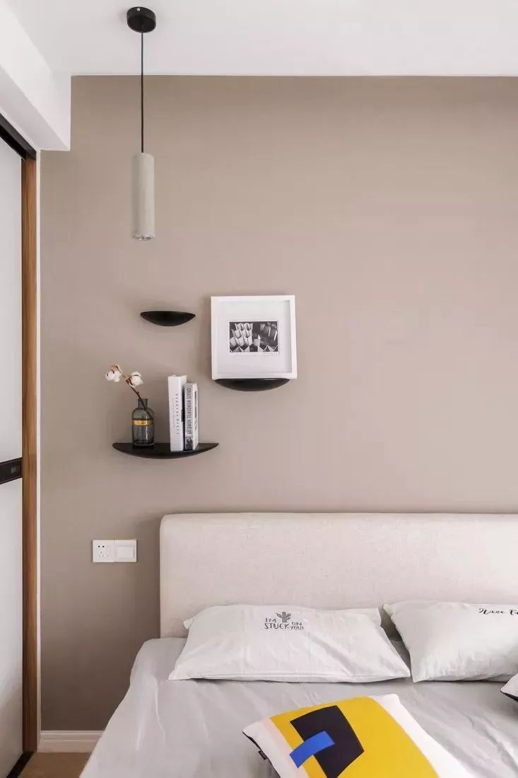 墙面设计了错落有致的搁板,代替了传统的床头柜,别致又好看。黄色的抱枕起到了提亮空间的作用。