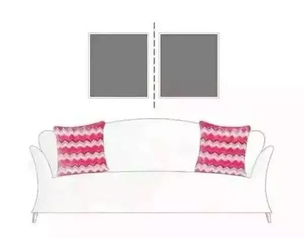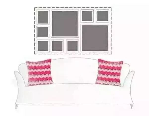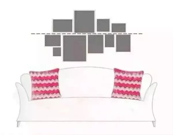 这种挂法简单易操作,也是我们最爱用的挂画方式,以沙发为参考物,找好中心点,图片的选择,最好是同一色调、或是同一系列的图片,效果最好。