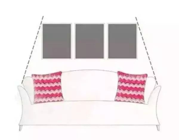 三幅装饰画在同一水平线上,挂画的总宽比被沙发略窄,并且均衡分布。图片建议选择同一色调或是同一系列的内容。