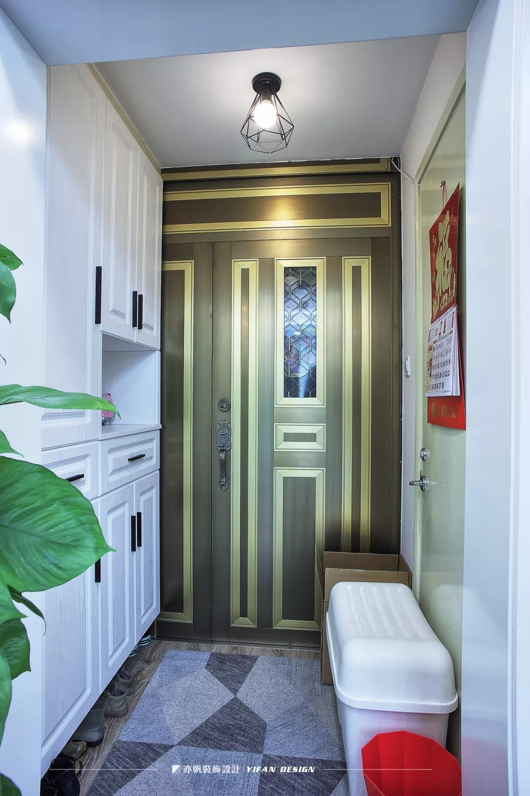 几何镂空造型的吊灯,颇有设计感。白色的橱柜十分实用,帮助户主收纳出门所需的小物件。