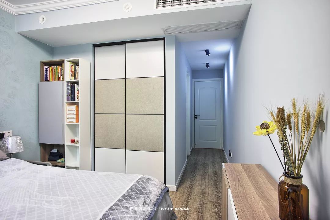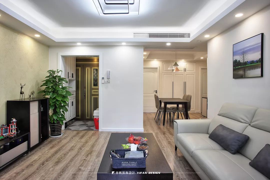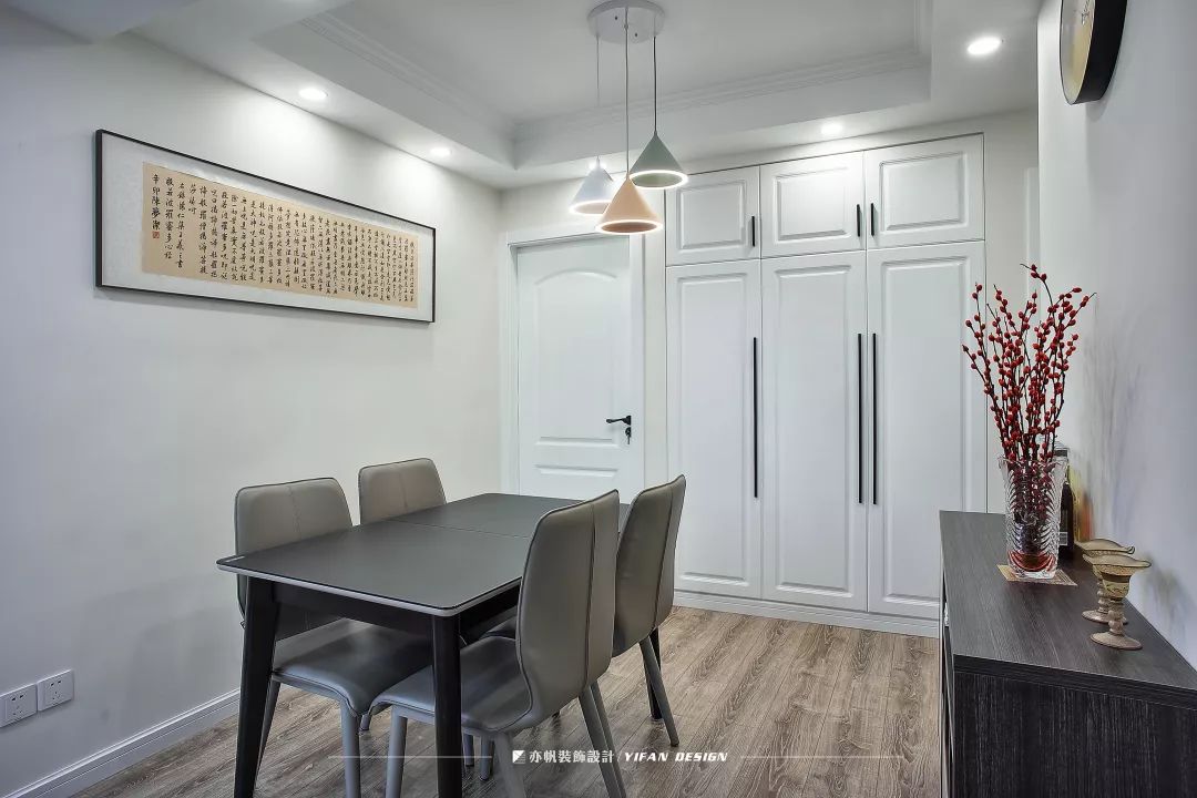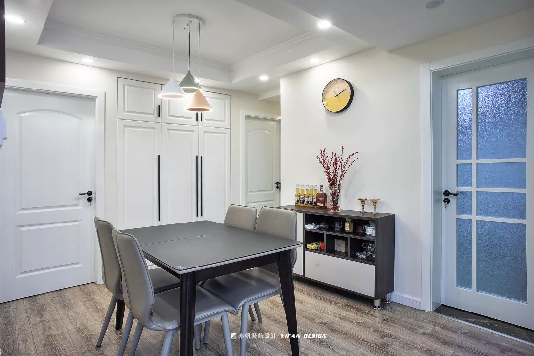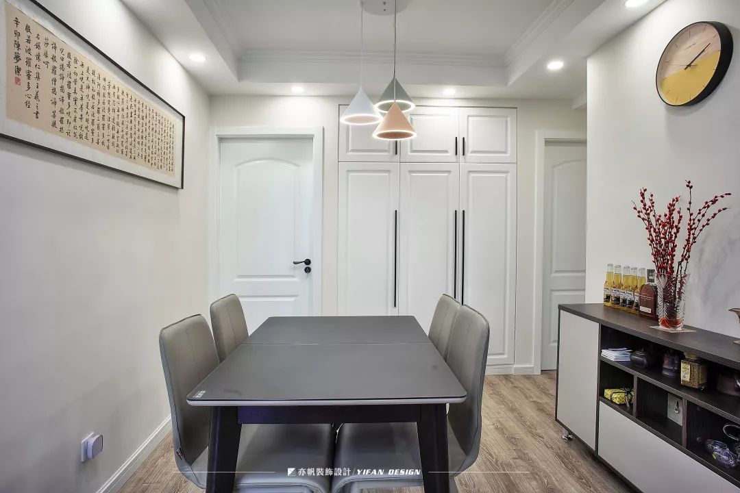 基本情况:户主是三口之家,有一个活泼可爱的孩子。女主人想要在主卧设置一个步入式衣帽间,龚雪设计师就将餐边柜和玄关二合一,腾出了所需空间。