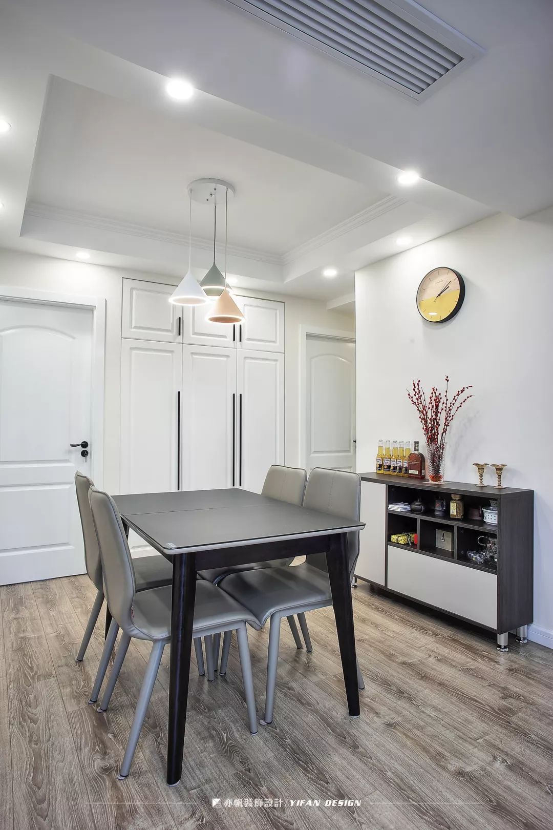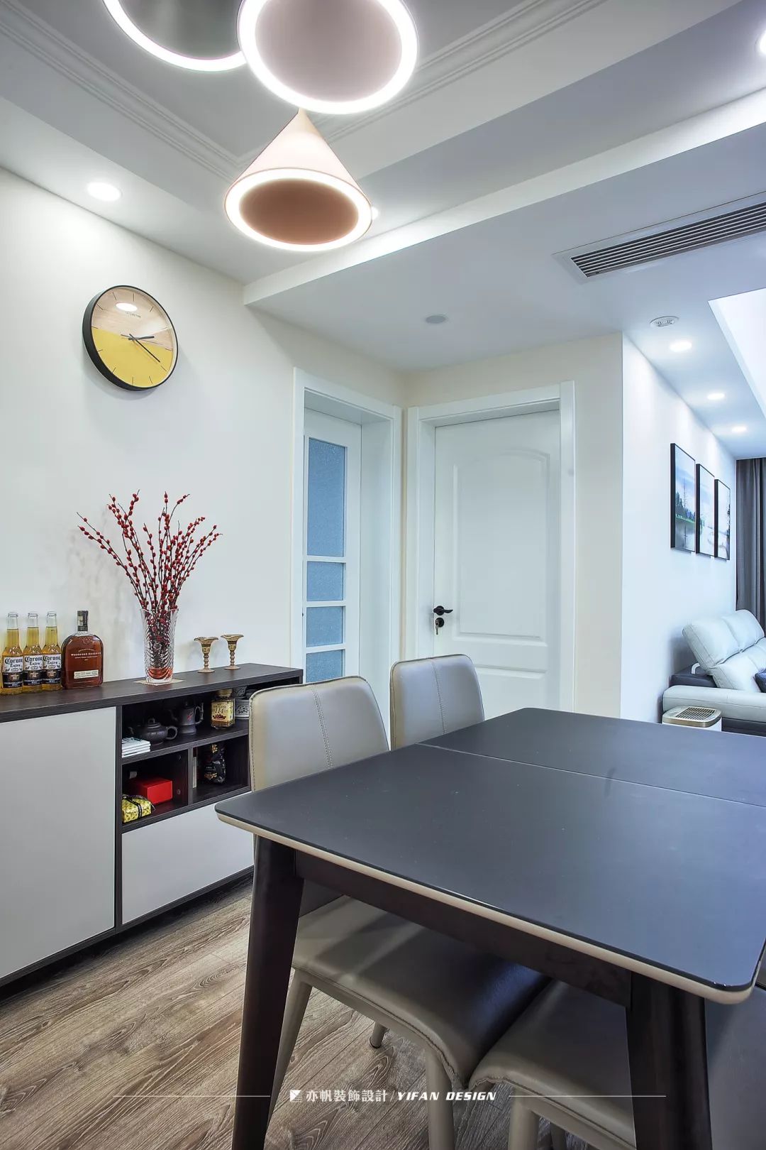 三色吊灯色调清新明快,极简的设计经久耐看。灰色的皮质座椅,统一而协调。矮柜收纳餐桌所需的物品,方便实用。