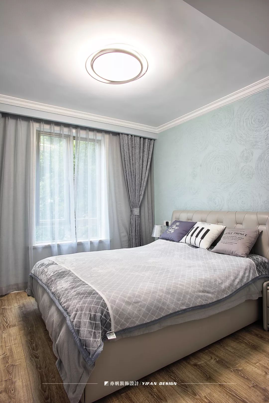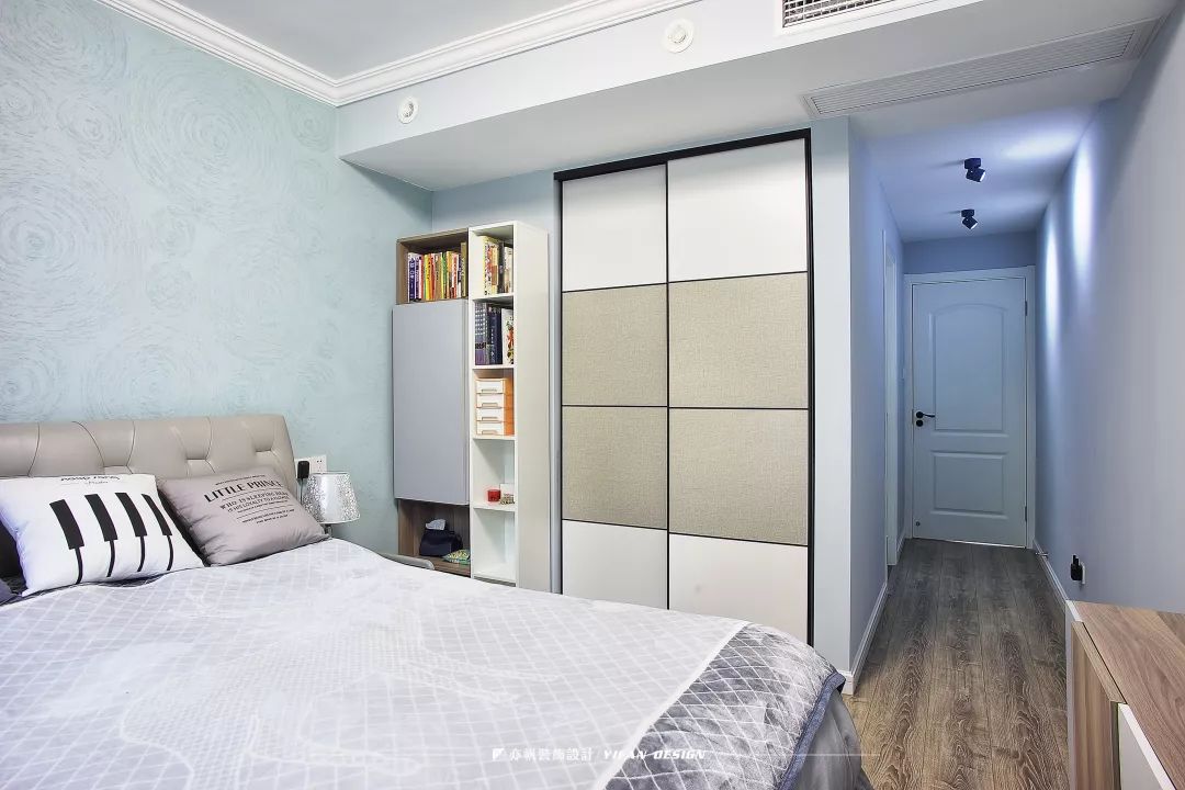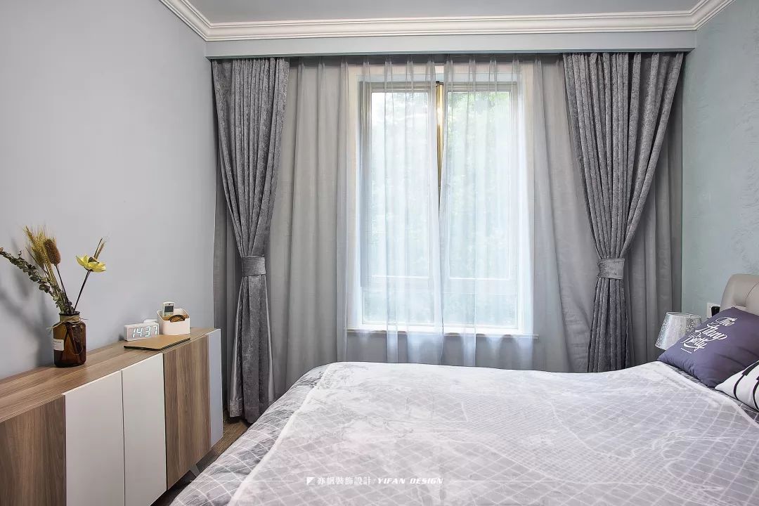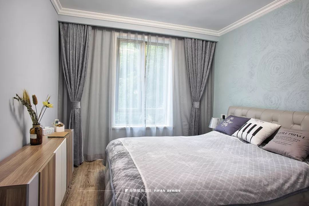 薄荷绿的墙面色调清新,仿佛让人置身于初春的森林。灰色的床品和窗帘,大气低调,简约耐用。床边的书柜,起到展示和收纳于一体的作用。