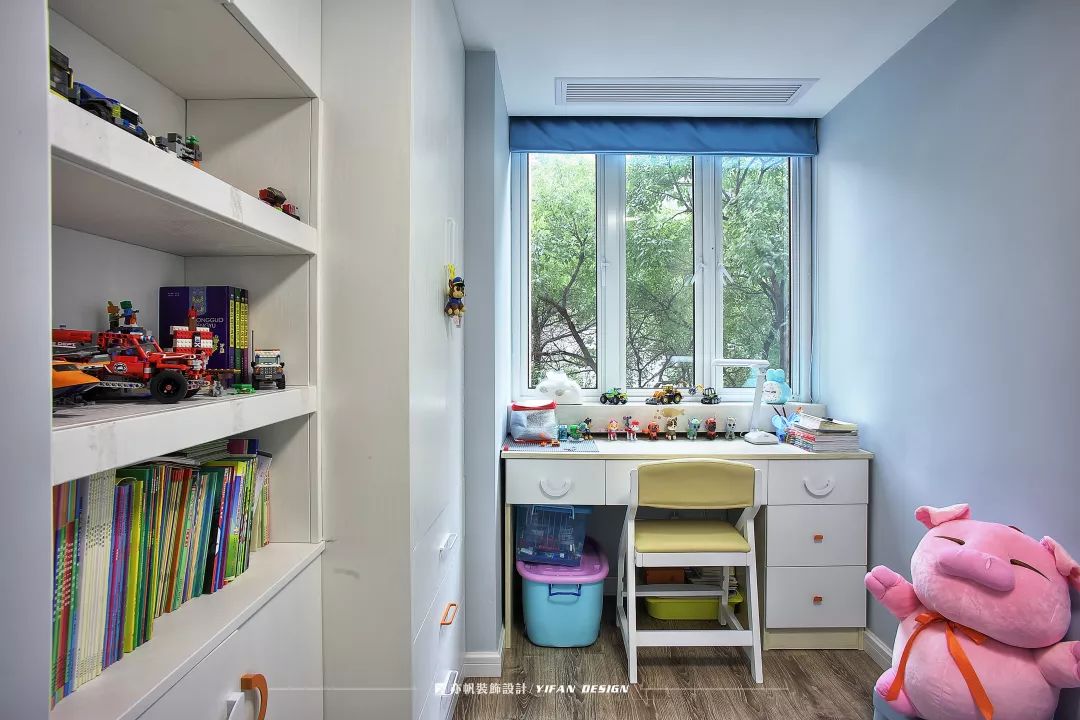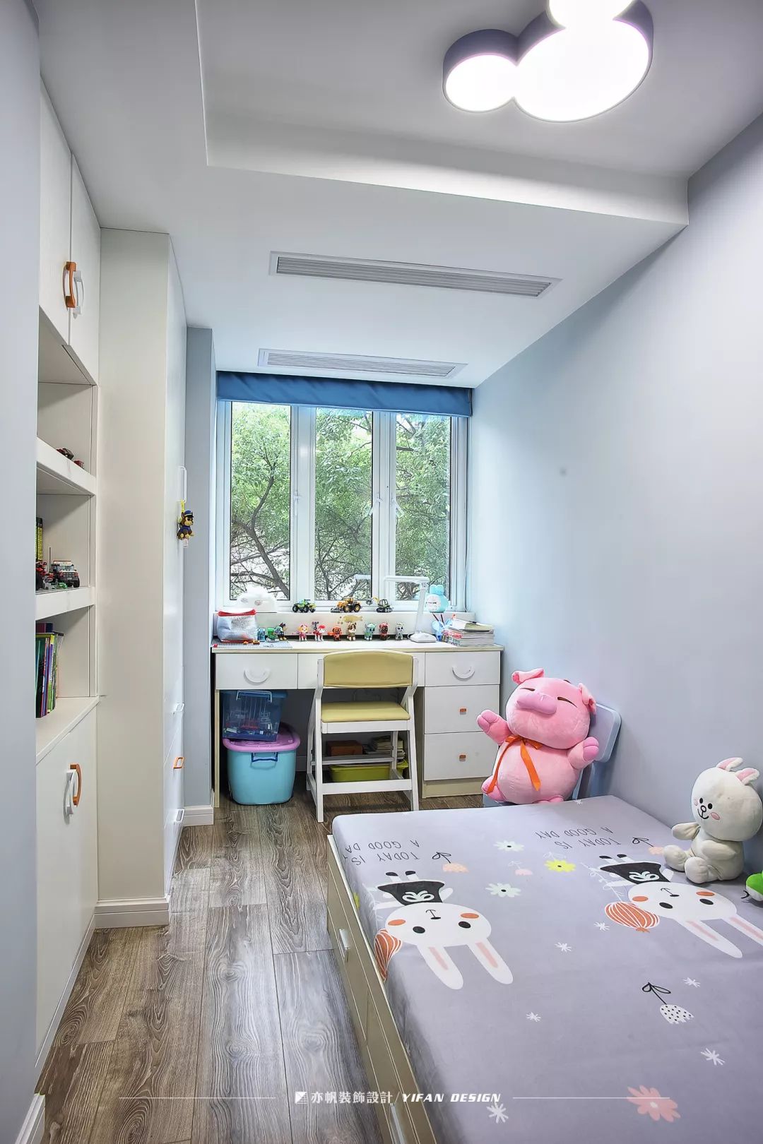 米奇造型的吊灯可爱童趣,孩子入睡之际也能安心许多。白色的书桌看起来干净整齐,正对着窗户,提供自然光,葱茏的绿意放松身心。