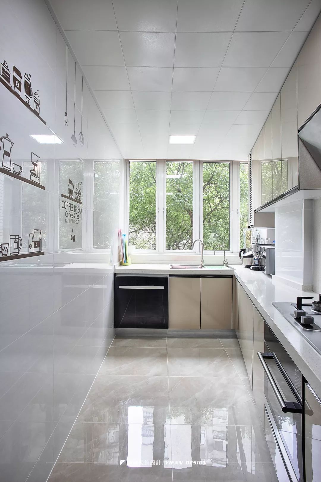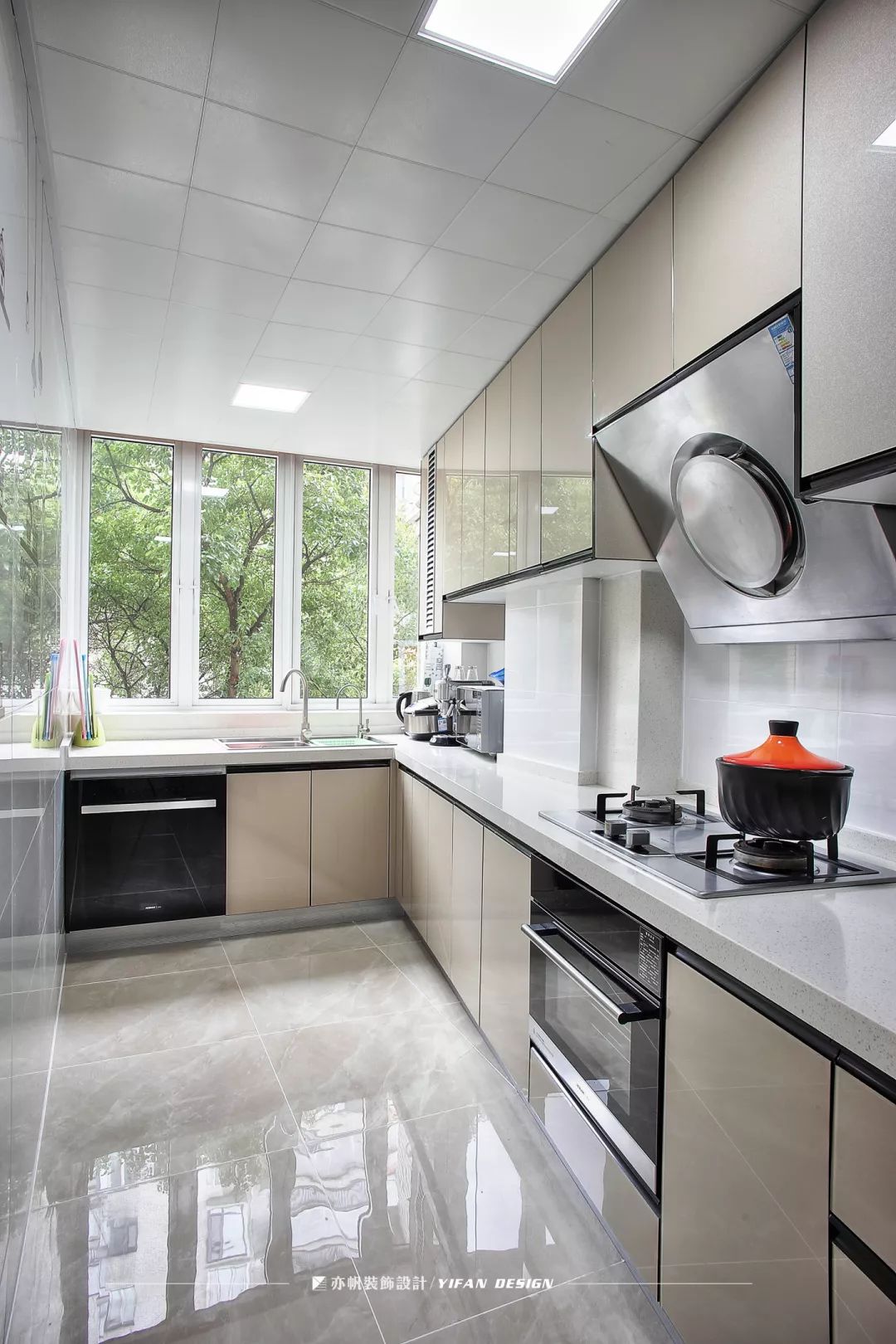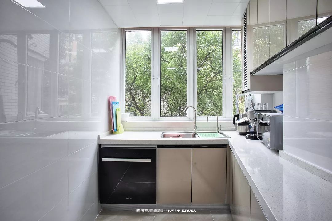 业主希望厨房是敞亮干净的样子,设计师就将窗户设计成如图的模样,让充足的自然光照进室内,然后通过白色瓷砖反光,体现出视觉上空间的延伸。
