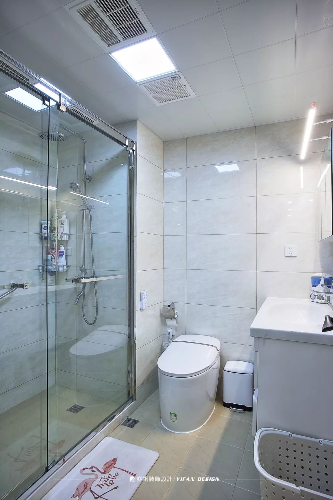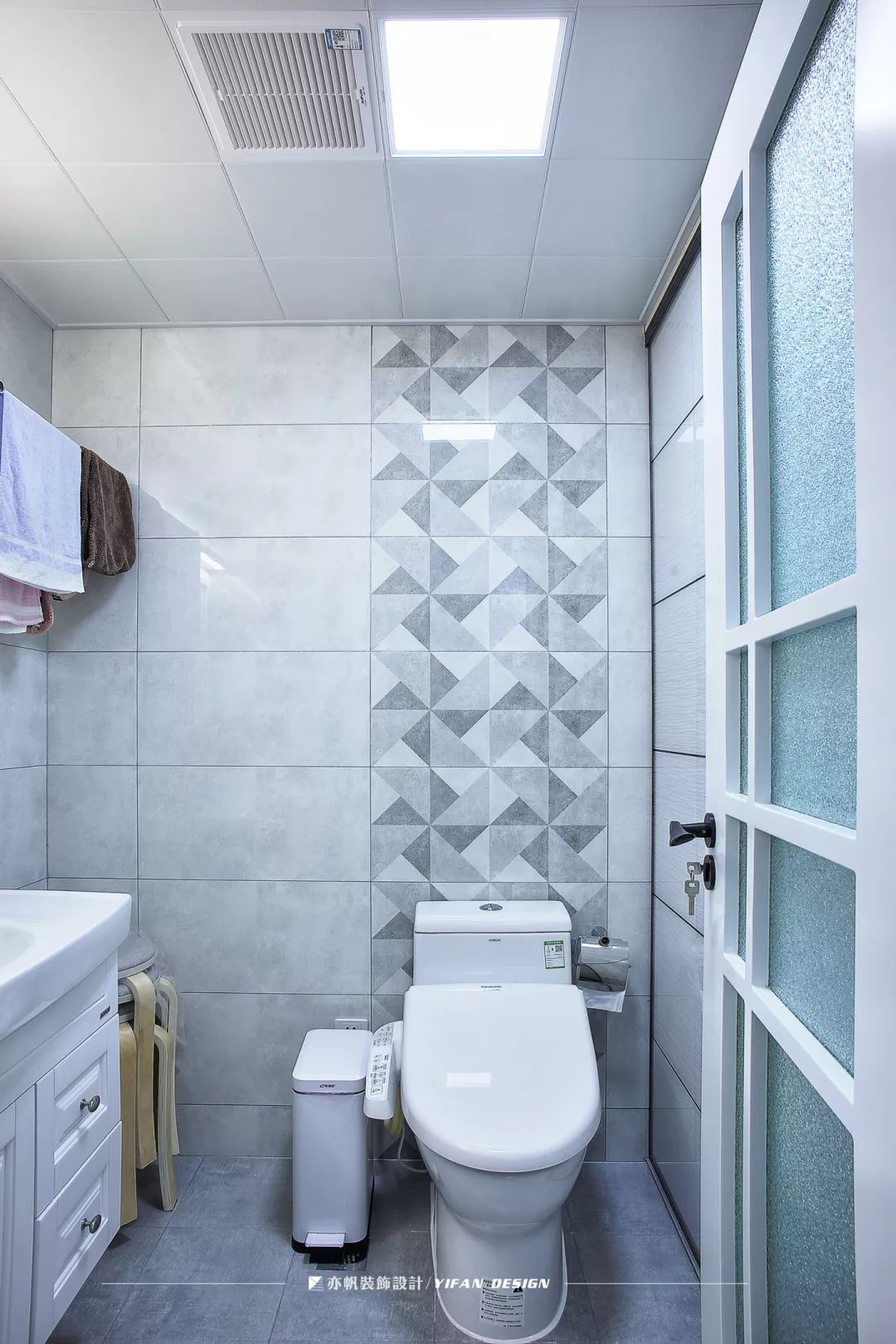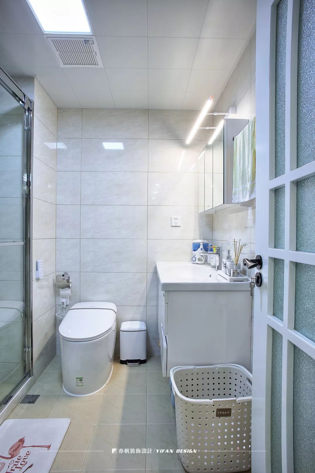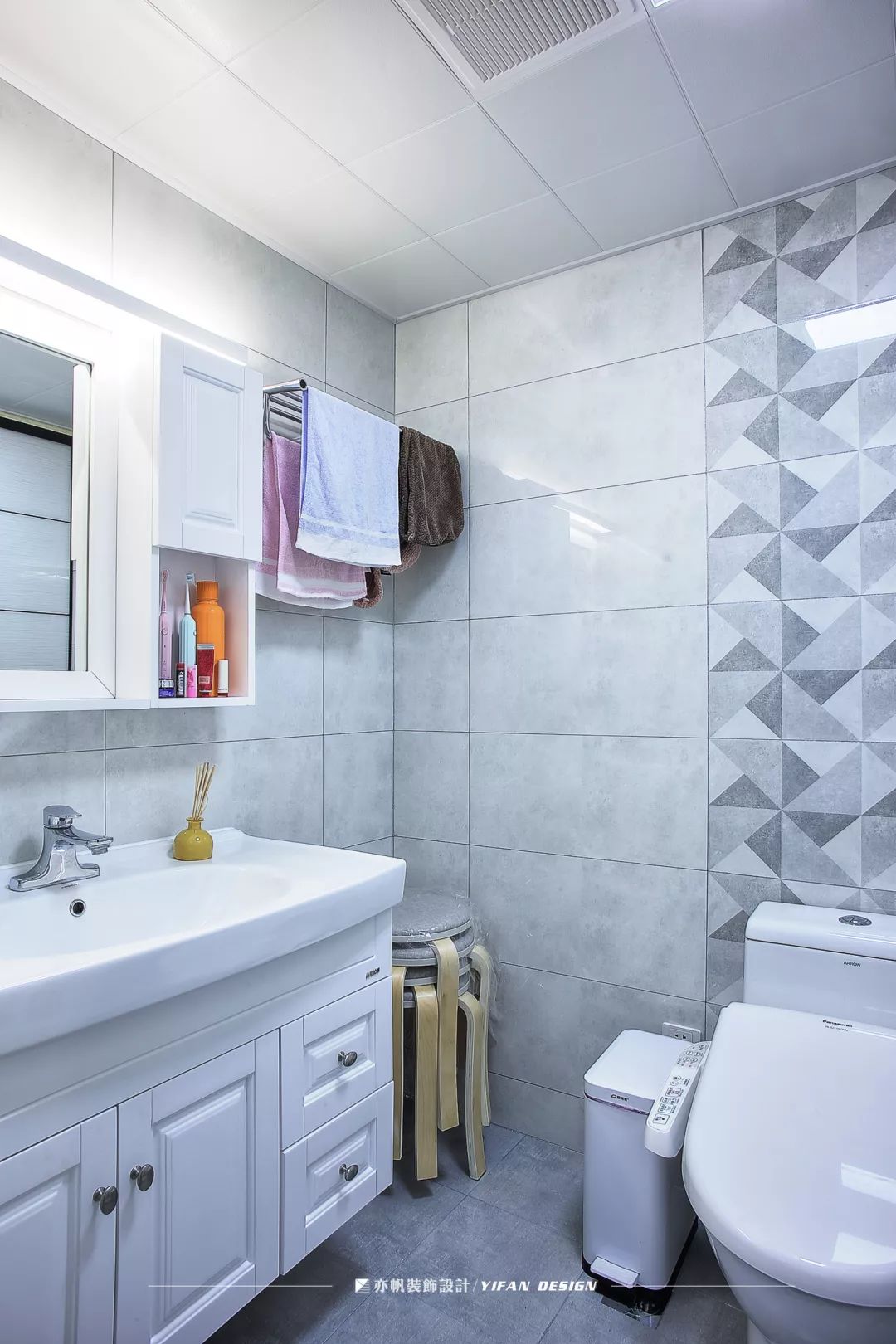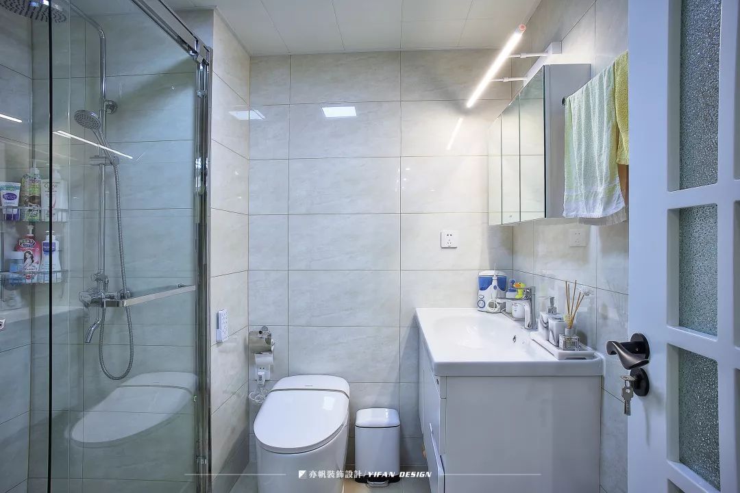 花砖的运用区别了功能区域,镜柜解决了盥洗室面积有限的问题,帮助屋主收纳日用品。