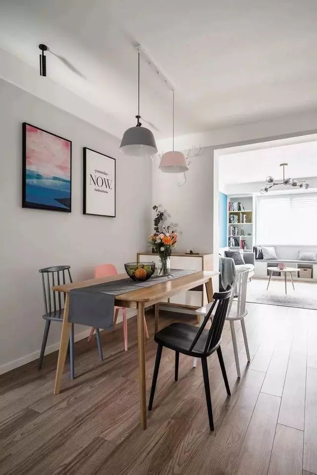 该户型是属于那种进门即是餐厅的房型,所以一开门便能看见这个简约时尚的餐厅。木质地板、餐桌与多色餐椅还有墙面简易挂画给人一种既放松又不缺美感的家居餐厅~