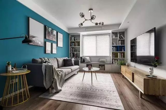 孔雀蓝的沙发背景墙很是吸引眼球~