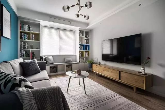 灰色的电视墙面与木质电视柜也是很搭的~还有靠窗的地方被改造成了实用型的飘窗设计,两侧内嵌式的展示格的收纳能力也是很强的,而中间位置既能收纳同时又还是一个时尚的休闲区,冬日里坐在此处看看书或者是什么都不做,就坐在此地享受阳光的沐浴也是一件很幸福的事~