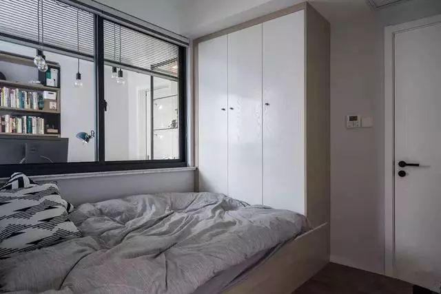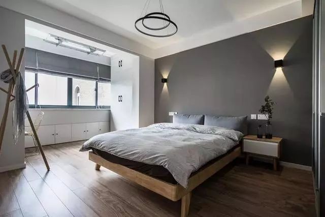 主卧的色泽是比较沉稳的,不管是深灰色的墙面还是大地色的地板~主卧里还有一个大大的阳台,做了强大的收纳设计~