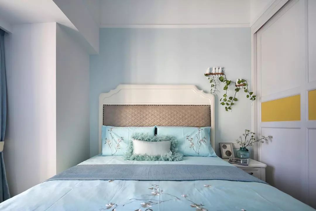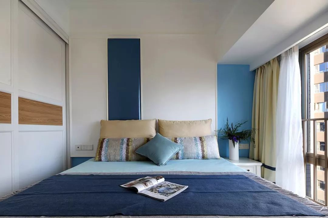 主卧室的床头背景墙上加入了蓝色的装饰,和蓝色的床品相互呼应。卧室内部简简单单的布置也充满了轻松舒适的氛围感。