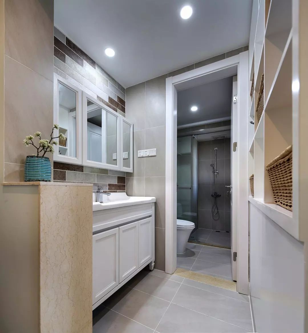 公卫的洗手台被放在了卫生间的门外,另一侧做上到顶的柜子,结合镜柜来使用非常的实用。以灰色为主的卫生间搭配白色卫具非常好看。