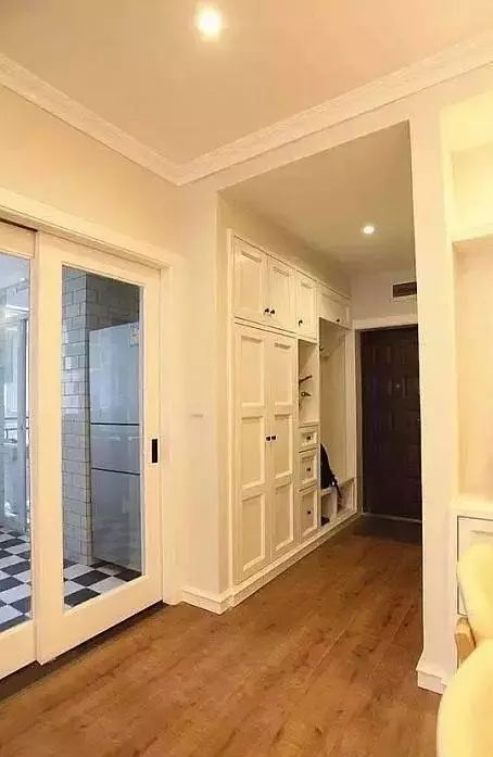 入门处,右排是一墙面的鞋柜,收纳问题得到大大的解决,左手边的门是卫生间。