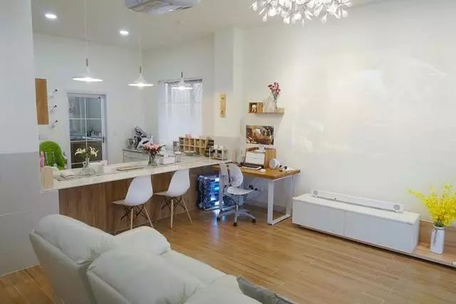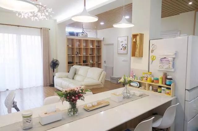 既是吧台又是餐厅的隔断桌,身兼数职啊,没办法,小户型就得这样设计才能把空间利用率做到最高。