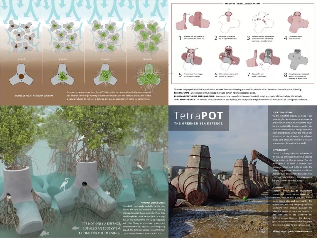 由有机材料和植物制成的具有未来前景的海防系统。当植物从TetraPOT内部生长出来时,根将交织在一起并逐渐成为天然的海防。形状和位置将使TetraPOT彼此互锁并形成结构化网络。该设计不仅可以防止土壤侵蚀,还有助于保护和创造自然栖息地。它不仅是一种防御,也是一种生态系统,是稳定性和美学的共生。