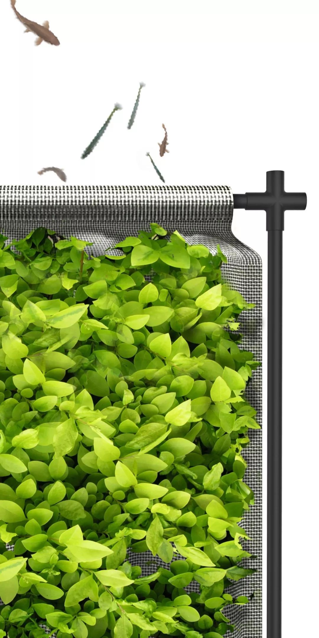 浮动花园是一种进化的三层3D双曲面纺织品。使用复合纤维填充物和0.5毫米珠子,它可以替代土壤并形成漂浮的绿色模块。浮动花园允许植物从水中吸收营养物质,而表面上生长的苔藓则为水生生物提供食物,成为生态系统的一部分。