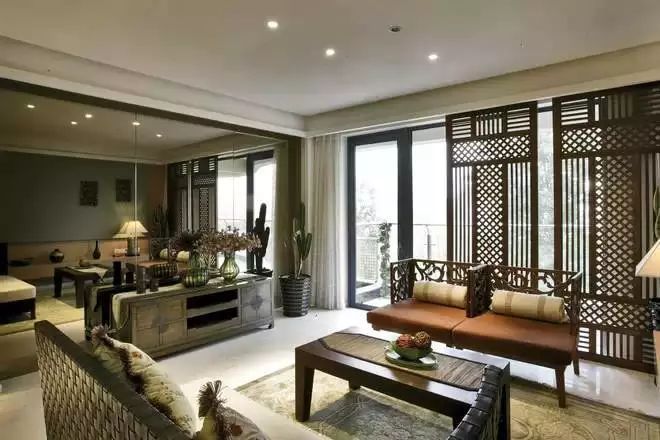 ▲整个客厅弥漫这异国风情,砂岩和抽木线条的造型组成了鲜明的东南亚风格,同时家具的搭配也更加的温和装修的主体特色。