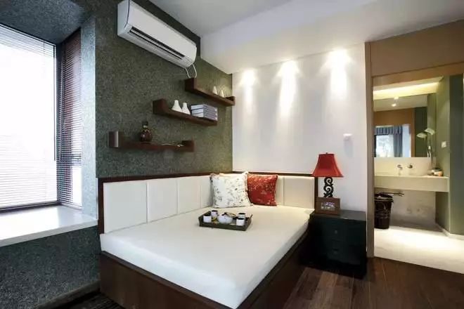 ▲卧室的背景墙采用白色和墨绿色墙贴的搭配,让空间更加赋有层次感,利用转角,设计了一个榻榻米床,更能烘托出东南亚风情。