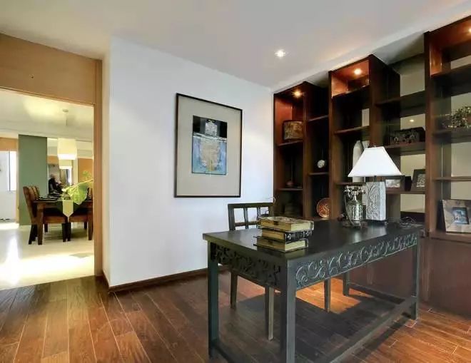 ▲书房整体以深原木色系作为亮点,开放式柜子和射灯的结合,提高了书房的档次。