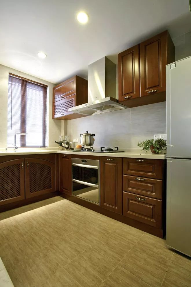 ▲原木色地板,搭配棕木色的橱柜,简单而朴素,让厨房看起来更加整洁。