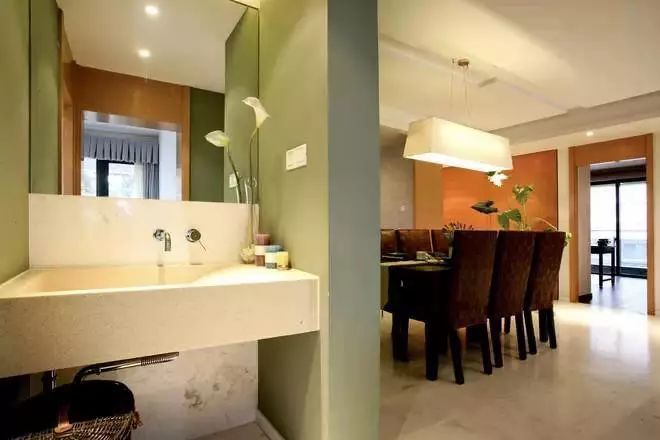 ▲卫生间的洗漱台在靠近餐厅的后面,青草绿的隔断带来了新的生机,更加便于主人的需求。