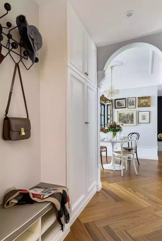 玄关处做成了地中海风格中常见的拱门,拱门在施工时,手艺尤其重要,且设计师和施工工人一定要有效沟通,并画出图纸保证能真正还原设计。预留了丰富的储物空间,墙上的挂钩可以方便地收纳包包和衣饰,下层鞋柜用来摆放拖鞋,也是座位。