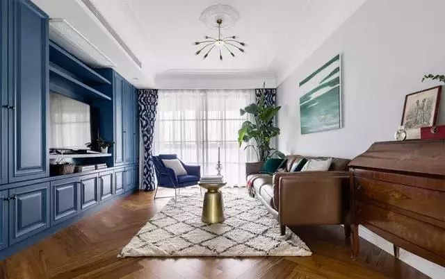 进入客厅,第一眼就会被马尔代夫蓝的电视柜吸引,这是设计师根据需求定制的。