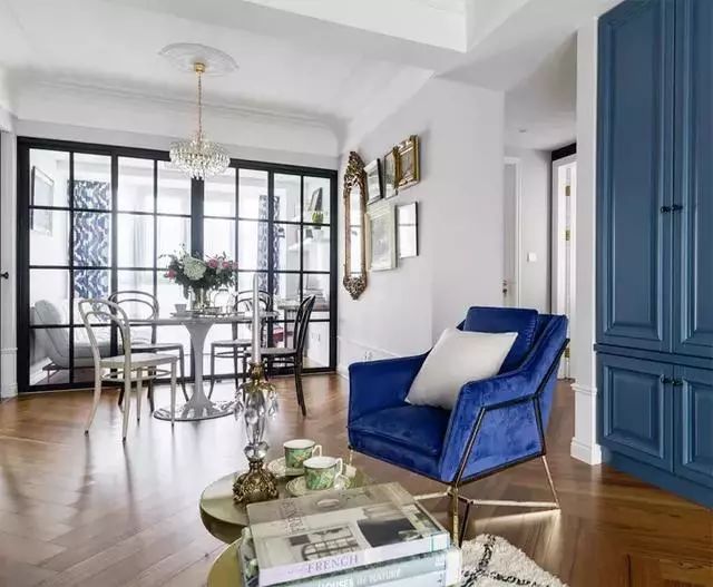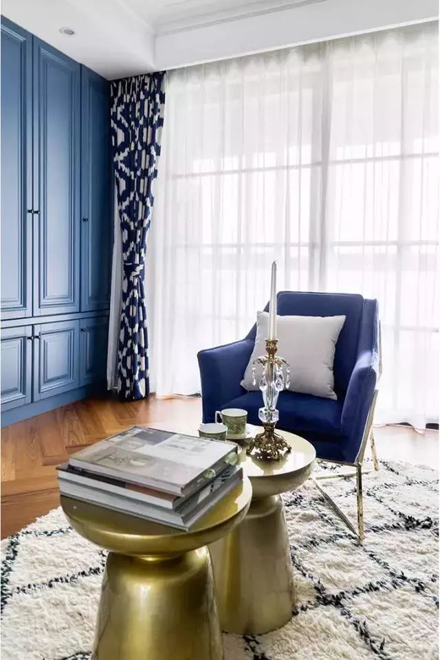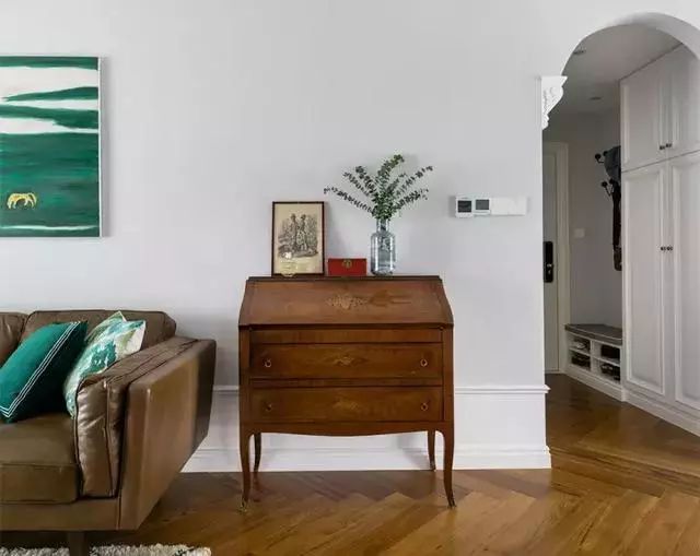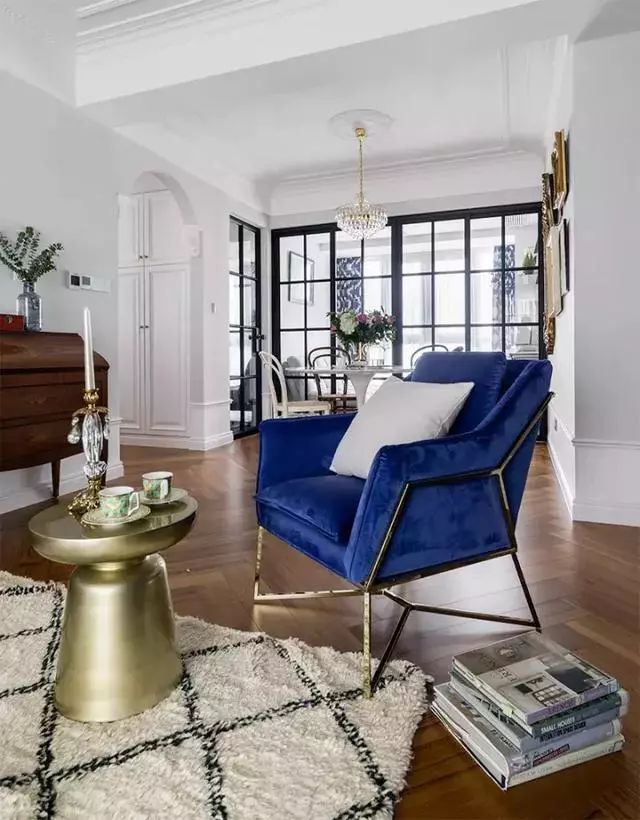 沙发右侧的是一张有些做旧的复古桌子,丰富了客厅收纳空间。摒弃了大而厚重的茶几,而是选择两个简单的哑光金欧式鼓凳。