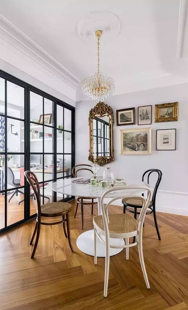墙上的镜子和挂画来自上海的欧洲古董家具店。餐椅是欧洲运回的原版曲木椅,顶上的水晶吊灯的水晶都是自己一个一个挂上去的。