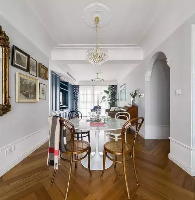 餐厅与客厅一体贯通,是最佳动线设计,也为孩子奔跑玩乐提供了更充裕的空间。餐厅是欧女士最满意的地方,墙上装饰的镜子、挂画、餐椅、水晶吊灯,都是屋主的心头好。