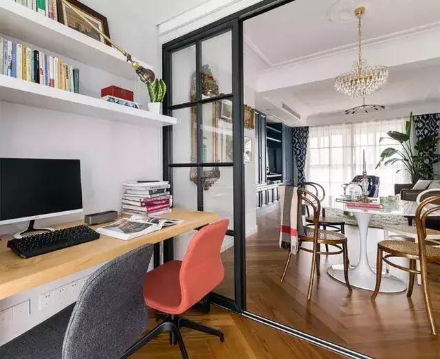 餐厅的玻璃轻质隔断门也非常值得一提,隔断门口原本是个阳台,很小很窄,非常鸡肋。在规划时因为家里正好需要一个书房,所以把原阳台向餐厅区域推进了一部分,变成了一个宽敞舒适的书房。