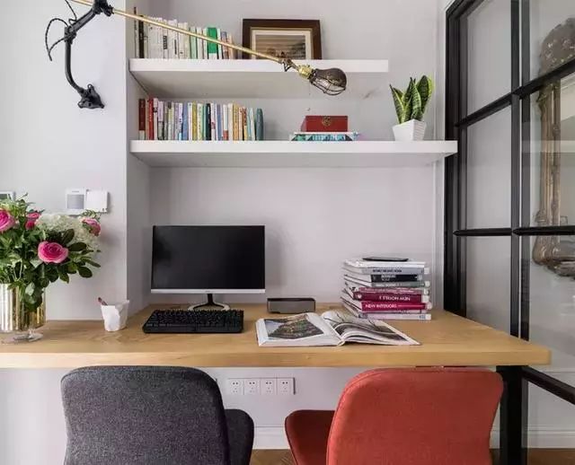 书房是利用原北阳台又借用了一些餐厅的面积来改造的,所以在隔断门上采用了玻璃隔断门,不损失采光。电脑椅选择了红黑两种颜色,不单调又很和谐。
