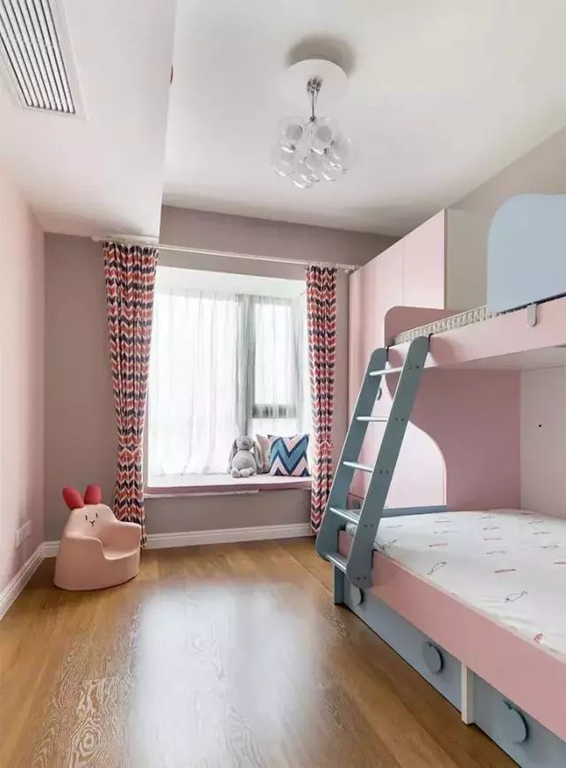 窗台飘窗部分被设计成孩子的玩乐的天堂,可爱的小兔子座椅是孩子的专属座。孩子的房间也设置了飘窗,白纱纱的窗帘,风吹起来是不是更梦幻了。