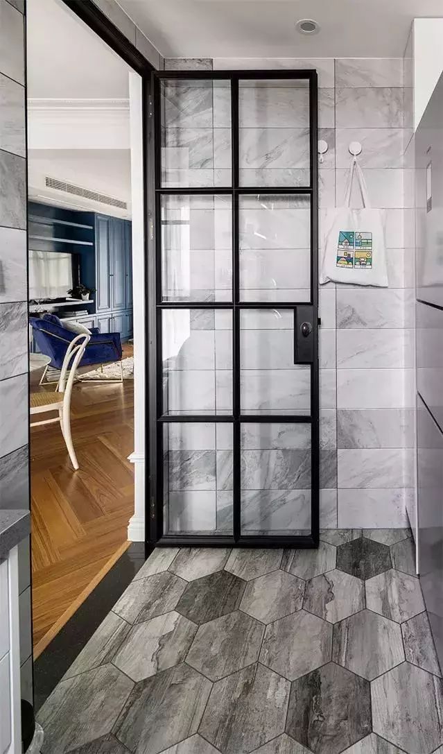 厨房和餐厅分别用了地砖和地板,施工中用大理石门槛过渡。关于地砖与地板的拼接,很多国外的案例是没有压条,直接拼接在一起,其实在国内也有很多不用压条的做法,拼接时,对工人手艺要求更高,拼缝可用深色硅酮密封胶勾缝,预留伸缩缝,然后注胶,就不会起鼓。