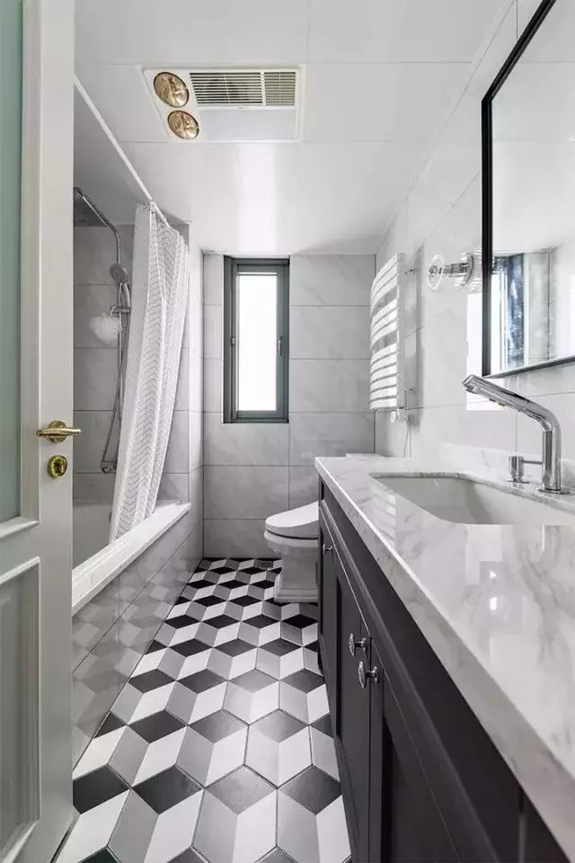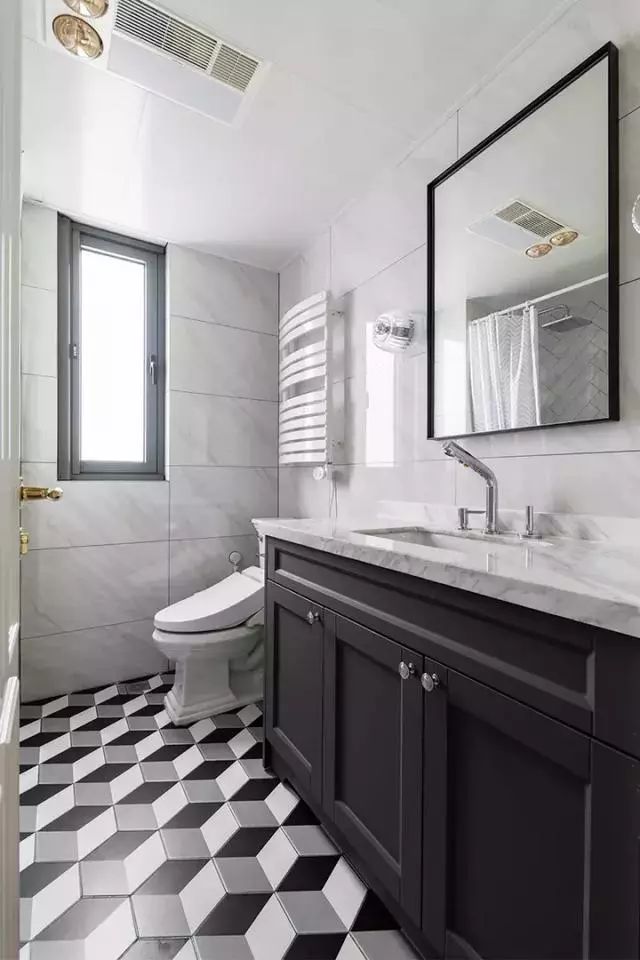 卫浴间的头顶排风和浴霸一体化,墙壁上增加收纳空间,马赛克3D瓷砖也很趣,马桶和卫浴间洁具均来自科勒。