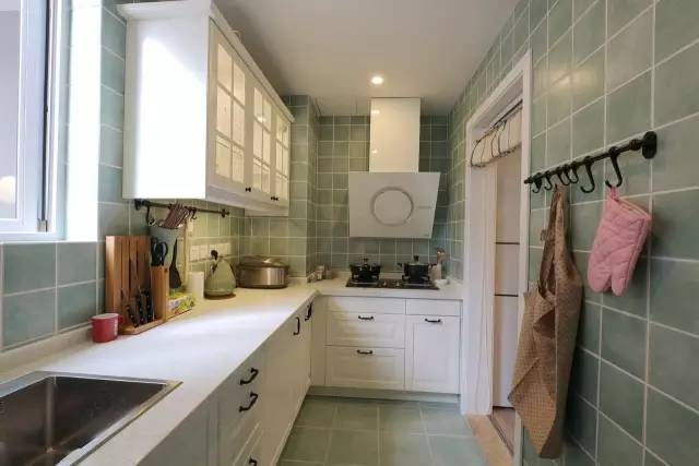 绿色的小方砖搭配白色的橱柜,简洁干净。