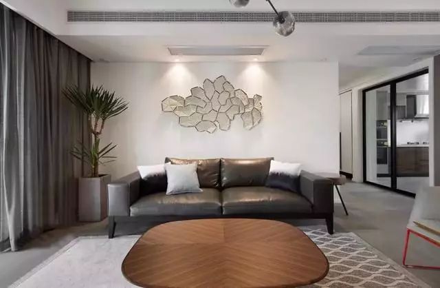 黑色皮质沙发造型简单大气,配合别具一格的沙发背景墙以及顶部的筒灯,极具现代感。