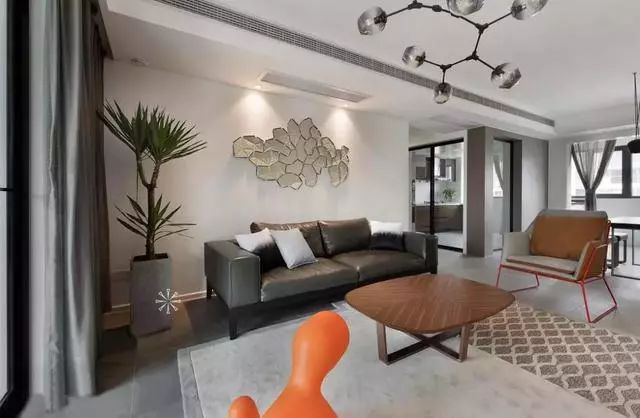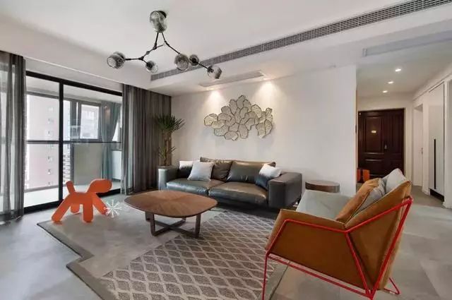 橙色装饰与绿色盆栽使色彩更加丰富自然,灰白几何图形的地毯使整个空间变得活跃起来。