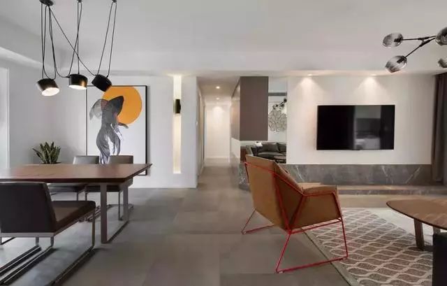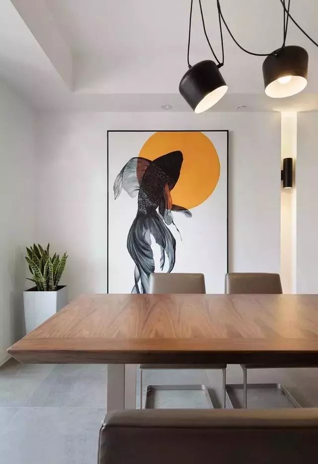 餐厅以一幅极具艺术感的画作为装饰,画框黑色线条与颇具质感的吊灯线条一起,增强空间层次感。