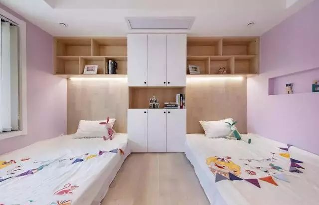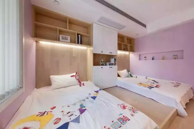 为小孩打造的粉紫色空间少女心满满,并行的双人床让彼此亲密而又独立。