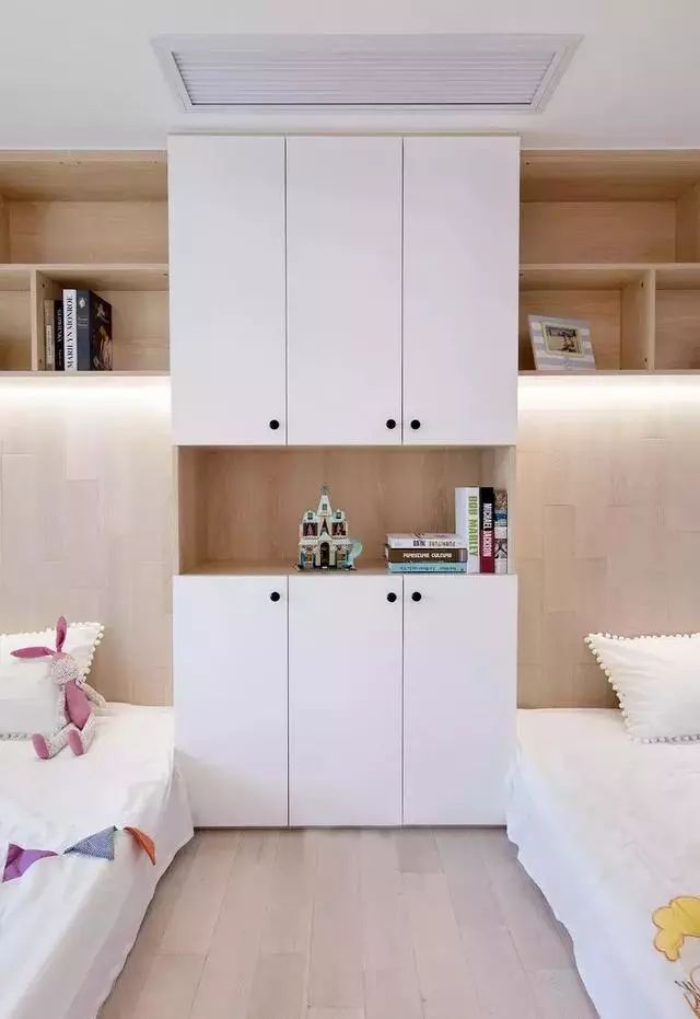 墙面设置了丰富的收纳空间,充分满足孩子们的收纳需求。