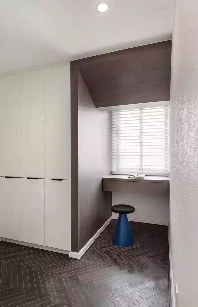 衣帽间以灰白色为基调,从容大气。利用角落空间,临窗设置了小书桌,既未遮挡光源,又有效利用了空间。