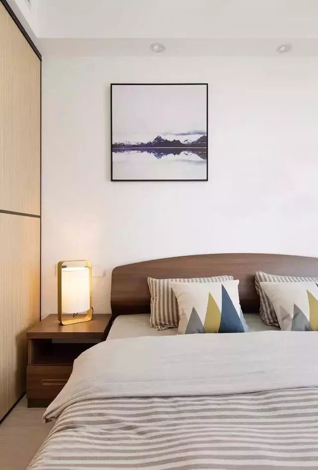 装饰画营造淡泊宁静的意境,柔软舒适的床品,暖暖的台灯,打造温馨的睡眠空间。