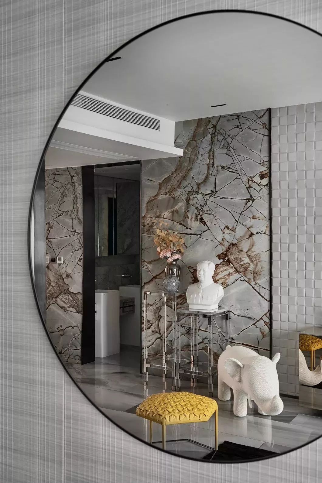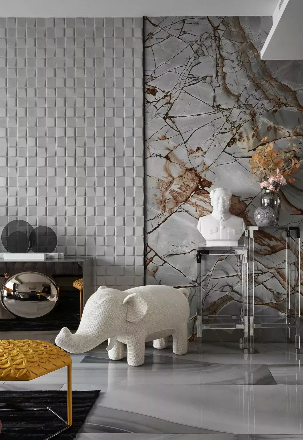 客厅的硬装极为简单,并无多余造型修饰,立体感的墙纸和花纹奇特的大理石是唯一的亮点。